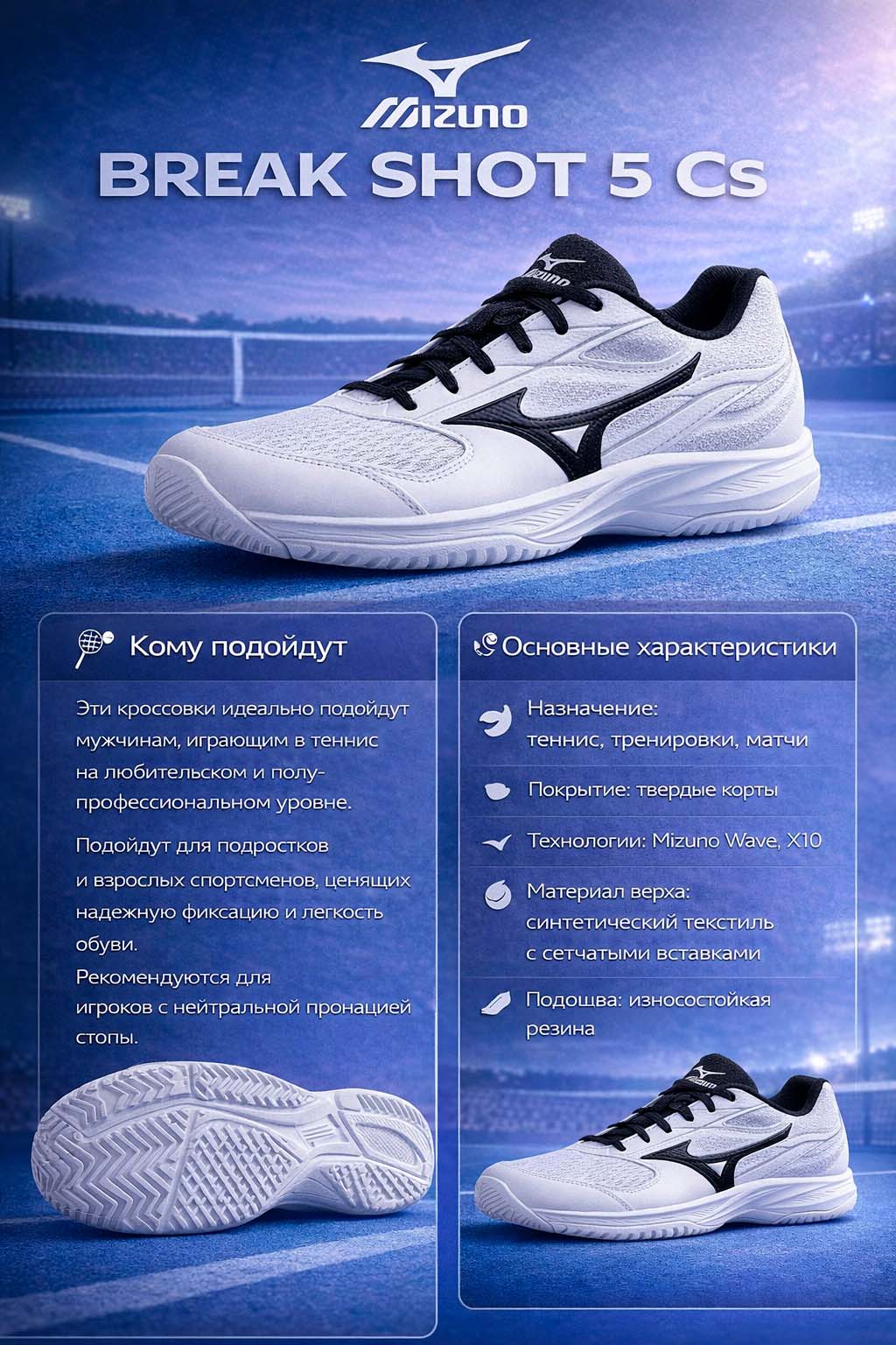 Мужские кроссовки Mizuno Break Shot 5 Cs разработаны специально для теннисистов, которые ищут сочетание легкости, надежной амортизации и устойчивости. Эта модель создана для тренировок и игр на твердых покрытиях, обеспечивая комфорт и защиту на каждом шаге.