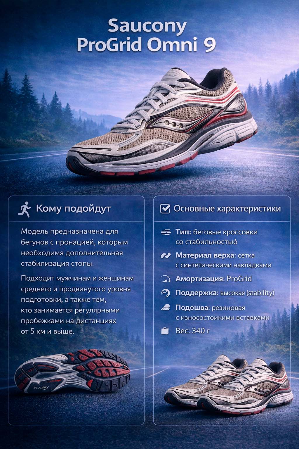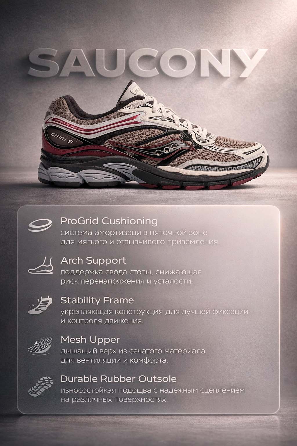 Спортивные кроссовки с акцентом на стабильность и амортизацию, разработанные для ежедневного бега и активной ходьбы. Модель подходит бегунам с умеренной и выраженной пронацией, обеспечивая контролируемое движение стопы и снижая нагрузку на колени и голеностоп. Также эффективно работают в повседневной носке за счёт сбалансированного сочетания поддержки и комфорта. Progrid Omni 9 сочетает классический дизайн и инженерные решения Saucony, что делает их надежным выбором для регулярных пробежек и прогулок на длинные дистанции на асфальте и твёрдых поверхностях.