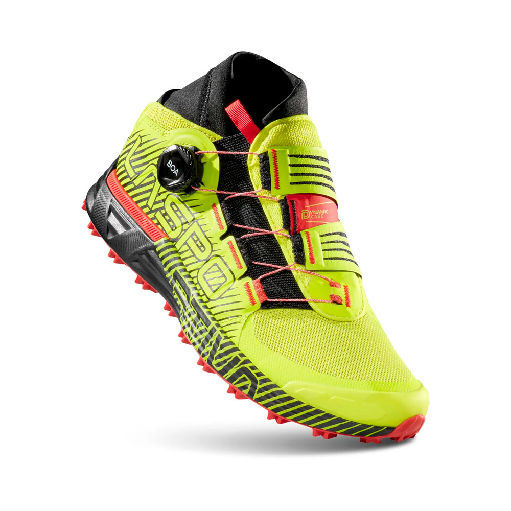 Cyclon — это спортивная обувь для скайрейсинга и гонок по пересеченной местности на средних дистанциях. Результат исследований и разработок между La Sportiva и BOA, это продукт, гарантирующий стабильность, точность и идеальную посадку благодаря новой системе Dynamic Cage™ на основе системы BOA Fit, которая работает в синергии с 3 различными элементами Верх для идеальной фиксации и устойчивости стопы для безопасного и точного спуска.