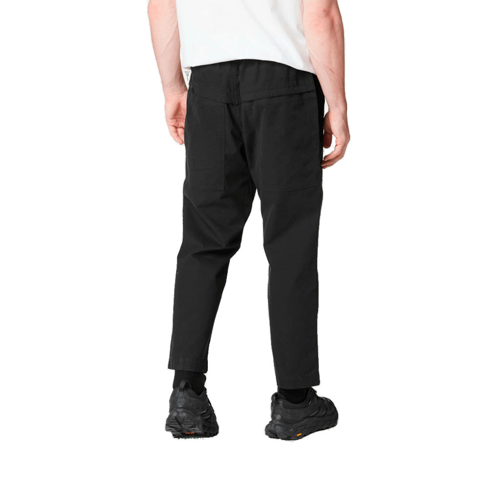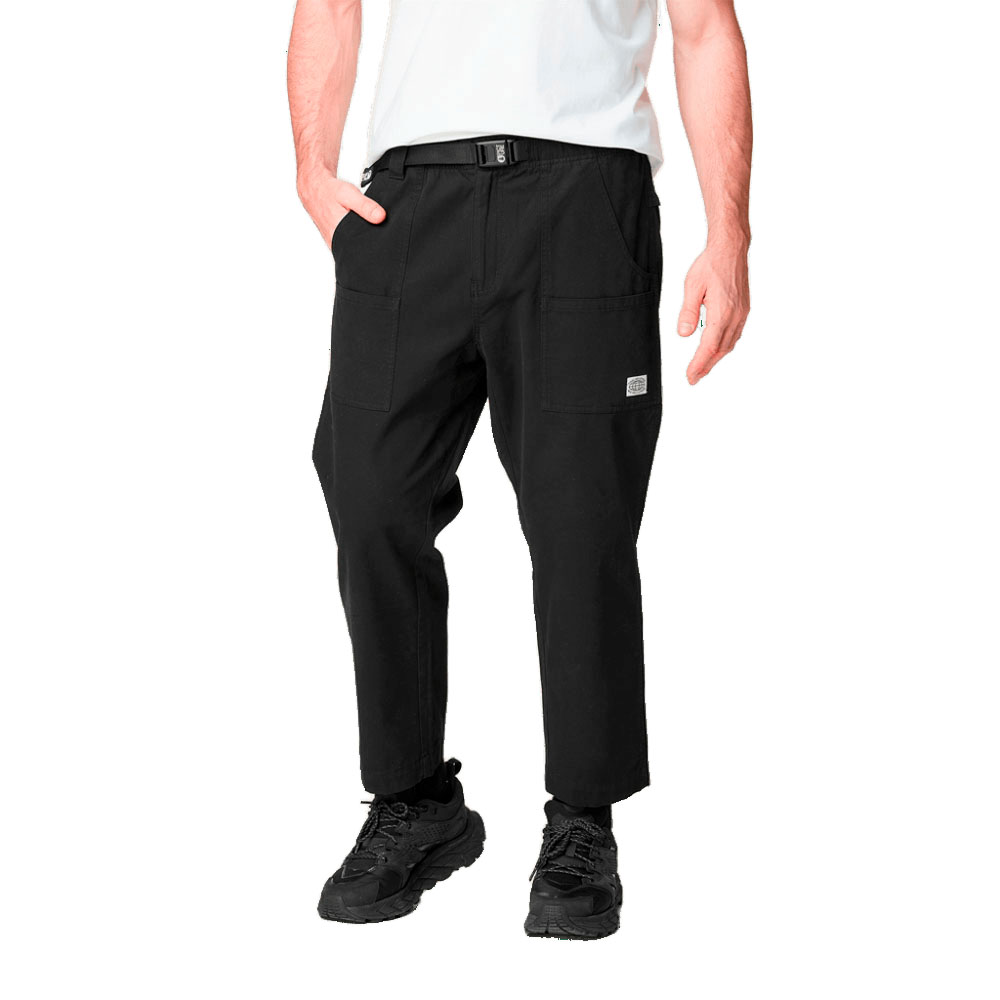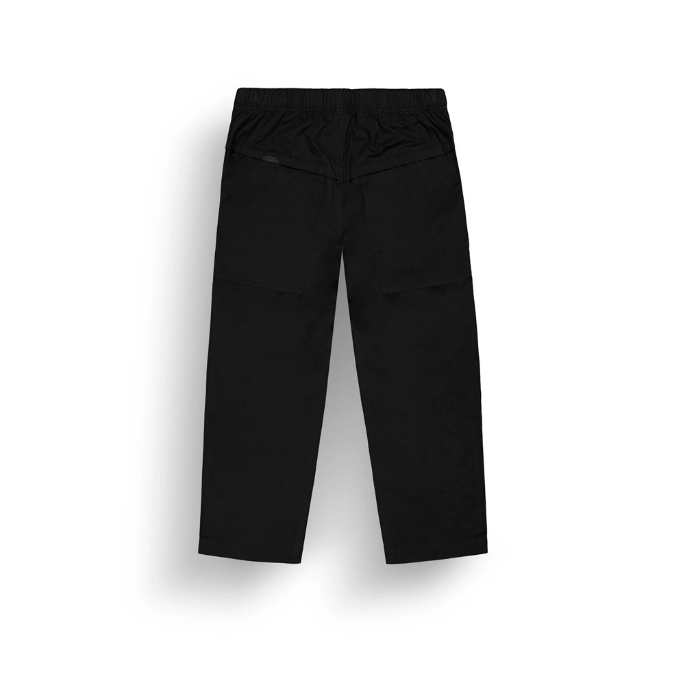 Основным материалом изделия является Stretch twill — плотная ткань саржевого плетения из органического хлопка с добавлением эластана. Такое сочетание обеспечивает высокую износостойкость и естественную воздухопроницаемость, позволяя материалу слегка тянуться и быстро восстанавливать форму. Эластичный пояс с интегрированным шнурком позволяет точно адаптировать посадку по талии, исключая необходимость использования ремня. Конструктивное решение с эластичными манжетами по нижнему краю предотвращает задирание штанин и обеспечивает дополнительный комфорт при движении или езде на велосипеде.