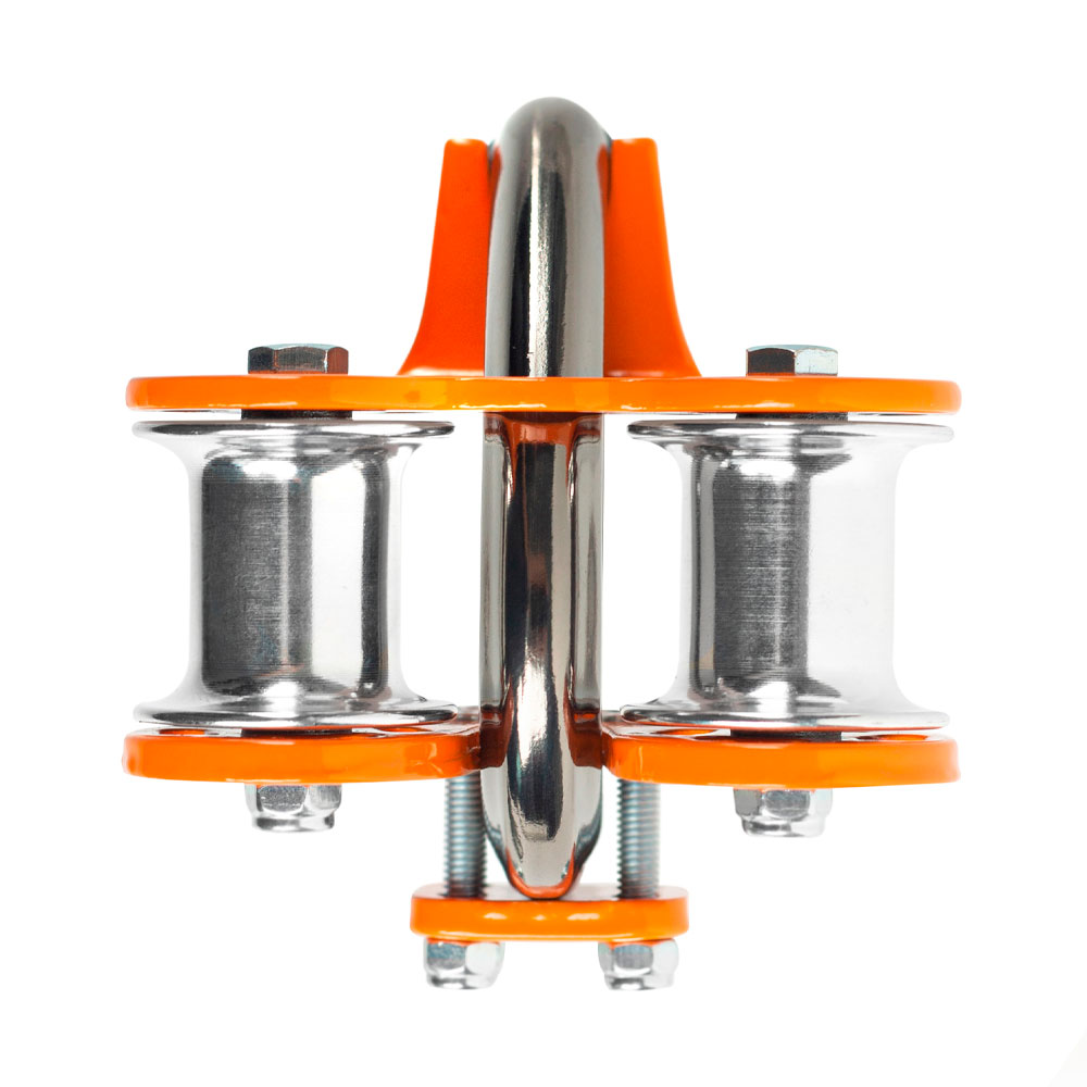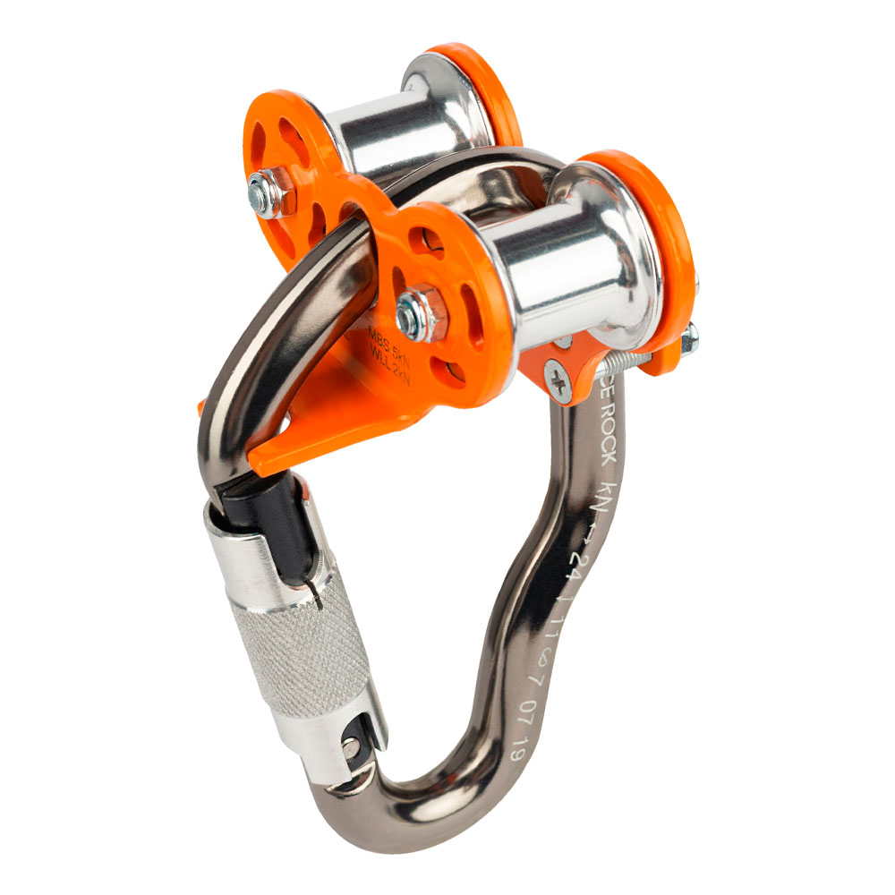 В конструкции блок-ролика используется прочный алюминиевый сплав, обеспечивающий малый вес и высокую устойчивость к нагрузкам. Подшипник качения гарантирует плавность и легкость работы с веревками, снижая износ и облегчая перемещение грузов или человека.