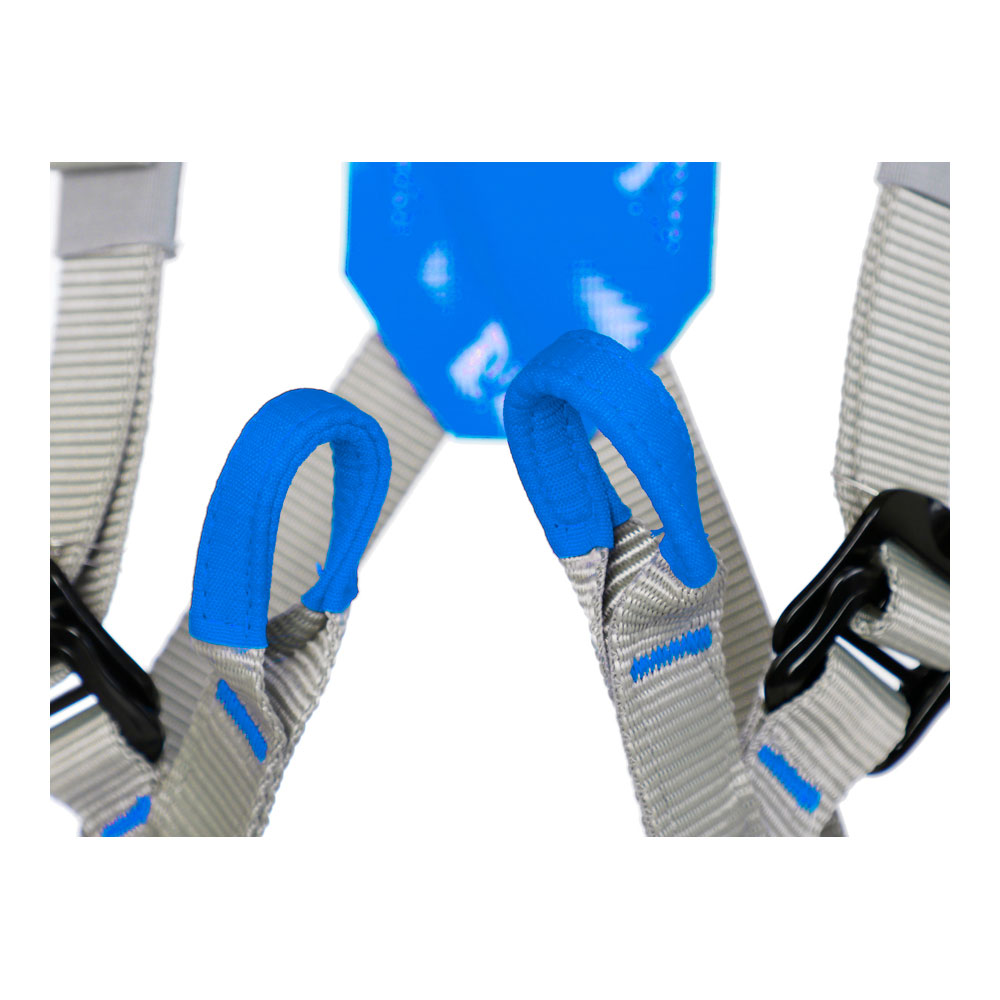 Обвязка выполнена из прочных синтетических материалов, устойчивых к износу и механическим нагрузкам. Регулируемые пряжки на плечевых и ножных лямках позволяют быстро адаптировать размер под рост и комплекцию ребенка. Широкие ленты обеспечивают равномерное распределение нагрузки и снижают давление на тело во время страховки.
