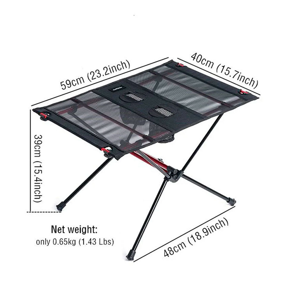 Конструкция выполнена с упором на мобильность и устойчивость: алюминиевый каркас с двойными перекрестными опорами помогает столу уверенно стоять на разных типах поверхности, а тканевая столешница с сетчатыми зонами уменьшает вес и объем в сложенном виде. Встроенные двойные держатели для стаканов делают использование на природе удобнее — напитки стоят отдельно и не занимают рабочую поверхность.