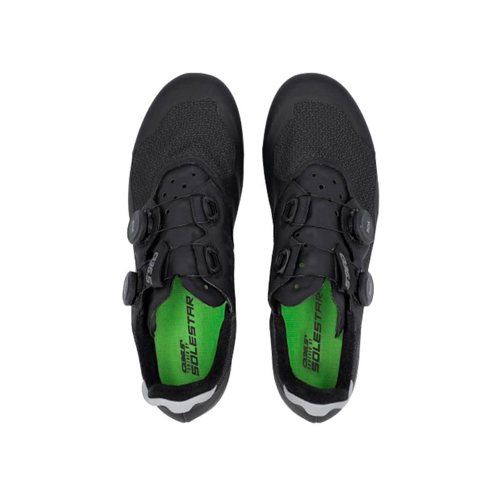 В конструкции туфель применена подошва Road Carbon Composite, обеспечивающая необходимую жесткость для эффективного ускорения при сохранении минимального веса. Инженерное решение Wrap Fit создает эффект кокона, равномерно распределяя давление системы фиксации BOA® Fit System Li2 по всей поверхности стопы. В комплекте используются ортопедические стельки Solestar, которые фиксируют ногу в нейтральном положении, снижая риск травм и предотвращая завал стопы. Материал верха обладает микроперфорацией для активного воздухообмена, а усиленная зона пятки препятствует соскальзыванию при агрессивном педалировании стоя.