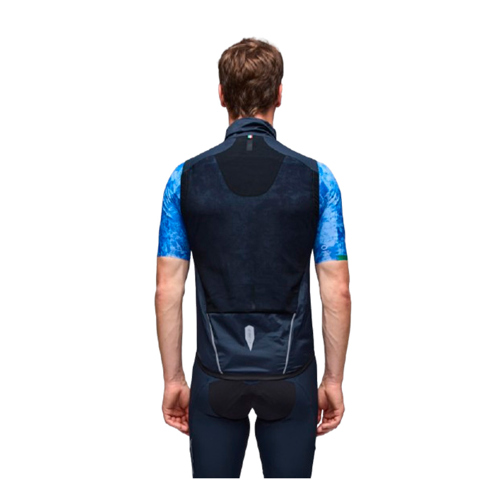 В жилете применена уникальная ткань UF Air Fabric — материал сверхплотного плетения, который обладает высокими ветрозащитными свойствами без применения мембран, что позволяет сохранить естественную вентиляцию. Наружная поверхность обработана экологичной пропиткой DWR, которая защищает от дорожной измороси и тумана. Инженерное решение включает сетчатую вставку на спине для максимального отвода тепла при высокой интенсивности педалирования. Фиксатор молнии Cam Lock предотвращает самопроизвольное расстегивание от встречного ветра, а эластичные проймы рукавов обеспечивают герметичную посадку на плечах.