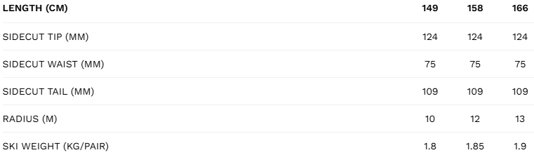 - Ski - Sidecuts dimensions 124-75-109 - 124-75-109 - 124-75-109